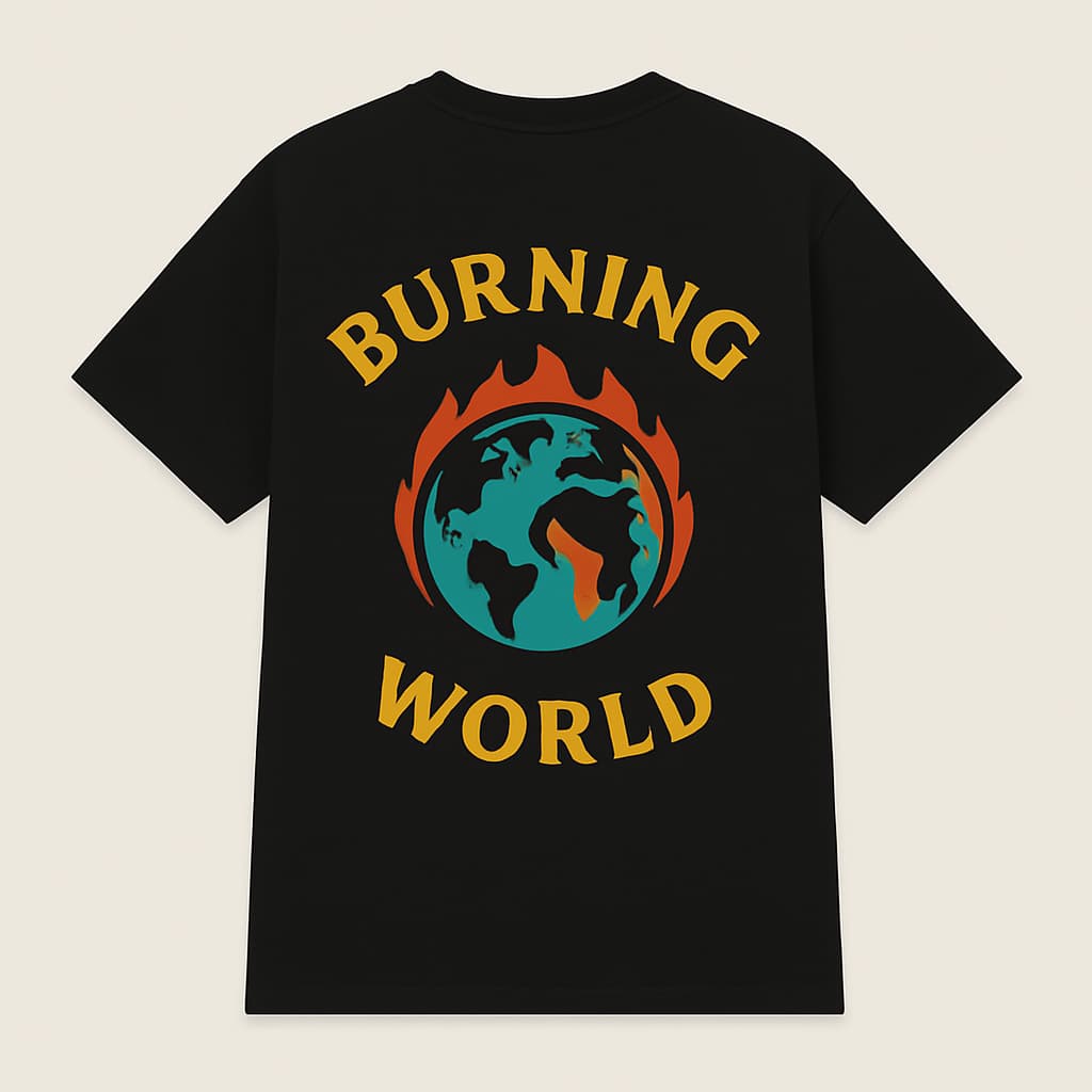 Make a statement with the Burning World Tee. Featuring a bold flaming Earth graphic, this piece is perfect for those who want their style to reflect awareness and power.